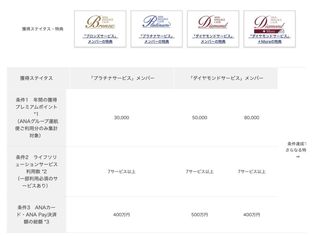 具体的には、ANAの航空便利用でのプレミアムポイントだけでなく、ANA関連サービスの利用数(ライフソリューションサービス)とANAカード/ANA Pay決済額の達成という “3本柱の条件” を満たすことで、ステータスが付与される制度を利用していたからです。ana.co.jp