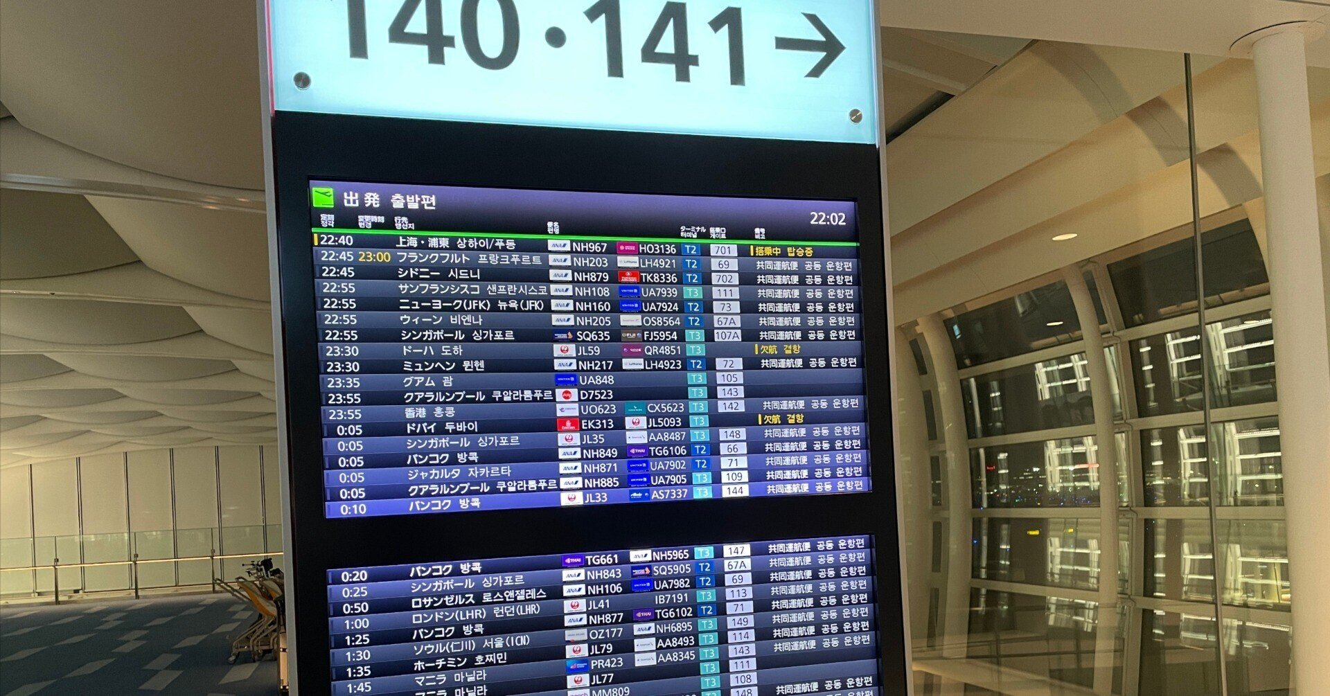 夜間は混雑に注意夜は韓国行き・東京行きなどのフライトが集中するため、かなり混み合うそうです。昼間のフライトを選べば、この快適さを独占できます。