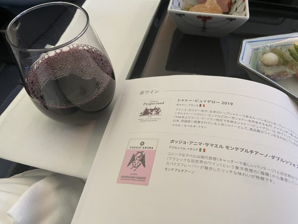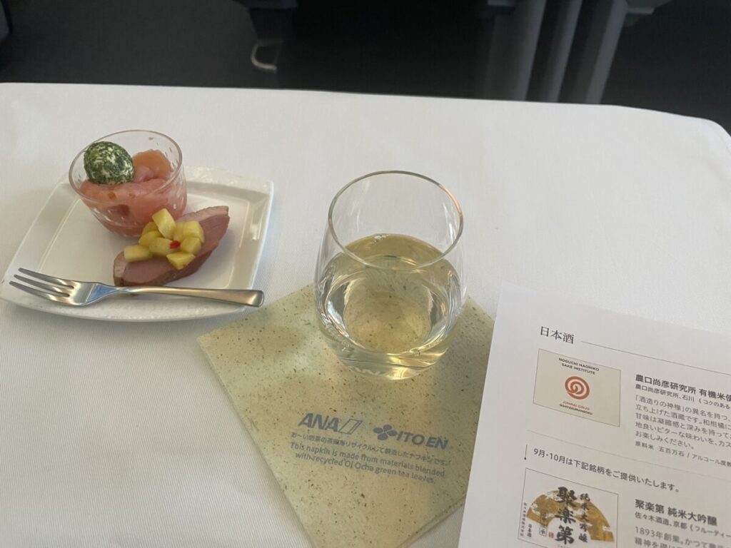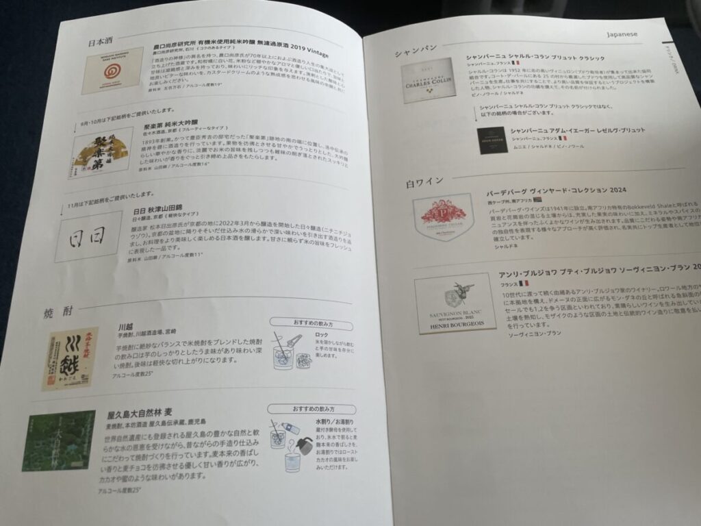 機内メニューには、レギュラー1種+期間で切り替わる銘柄が2種の合計3種類の日本酒が載っている様子。どれも個性的で、料理とのペアリングを楽しめるセレクションでとても悩みました。