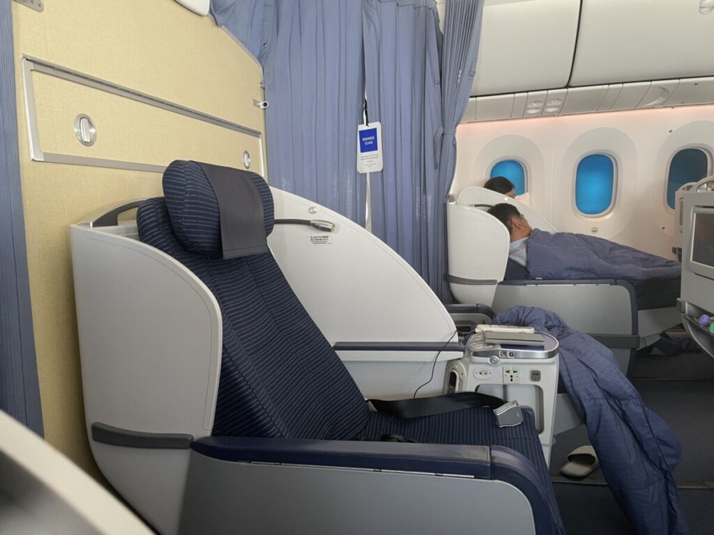 残り時間は座席をフラットにして、うとうとしながら過ごしました。スタッガード配列のシートは、隣を気にせず足を伸ばせるので、本当に快適です。