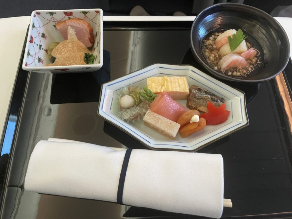 妻は洋食を選択し、ロブスターテールのマリネやその他前菜を楽しんでいました。私も一口もらいましたが、品の良い味付けと食材の質に感動。「空の上でこれだけの料理が出るなんて…」という感慨に浸りつつ、メインを待ち望みます。